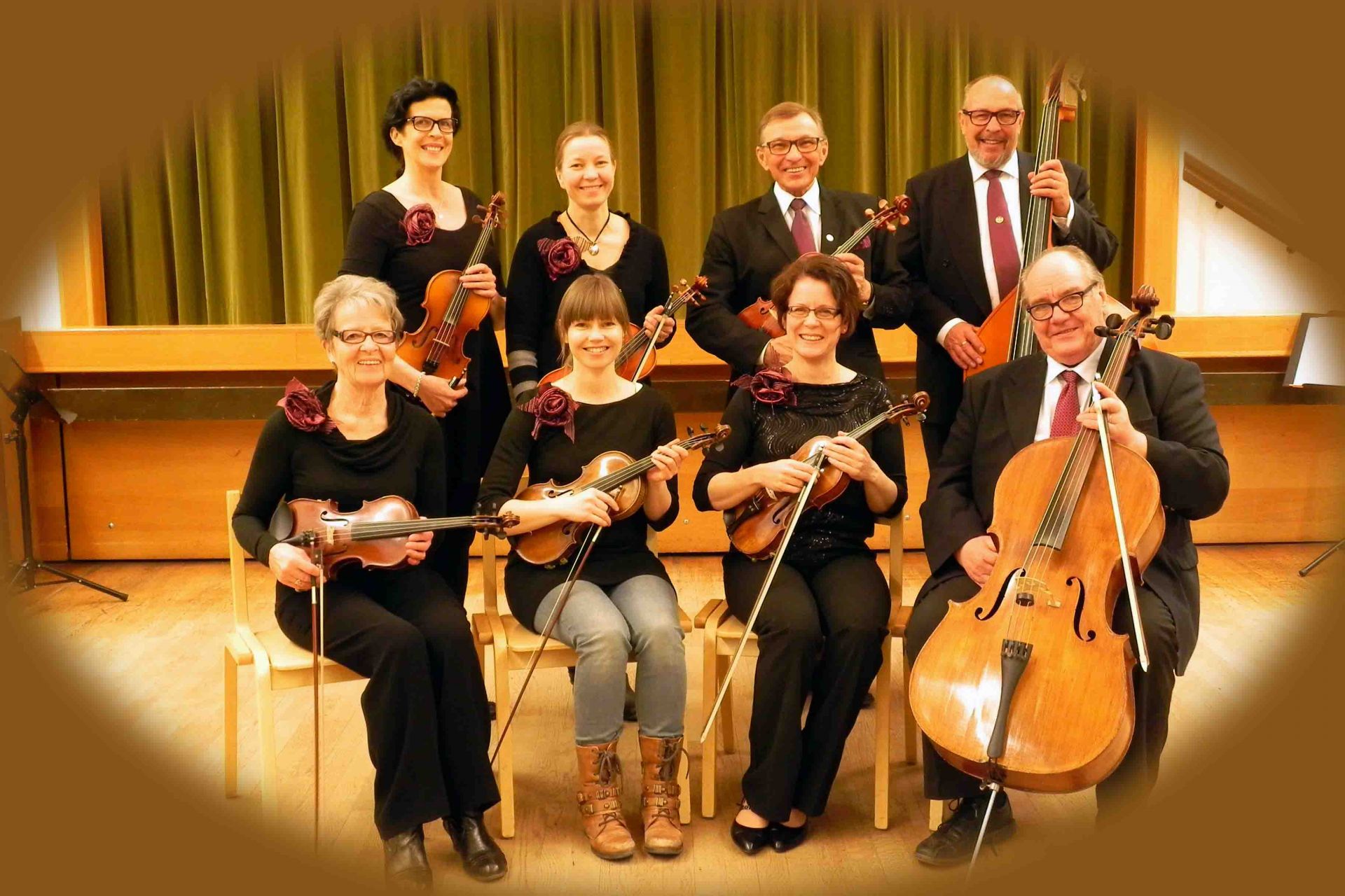 Vi är just nu tolv medlemmar. Sammansättningen består av olika fiolstämmor, altviolin, cello och kontrabas.