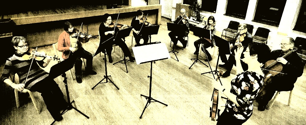 Vi är just nu tolv medlemmar. Sammansättningen består av olika fiolstämmor, altviolin, cello och kontrabas.